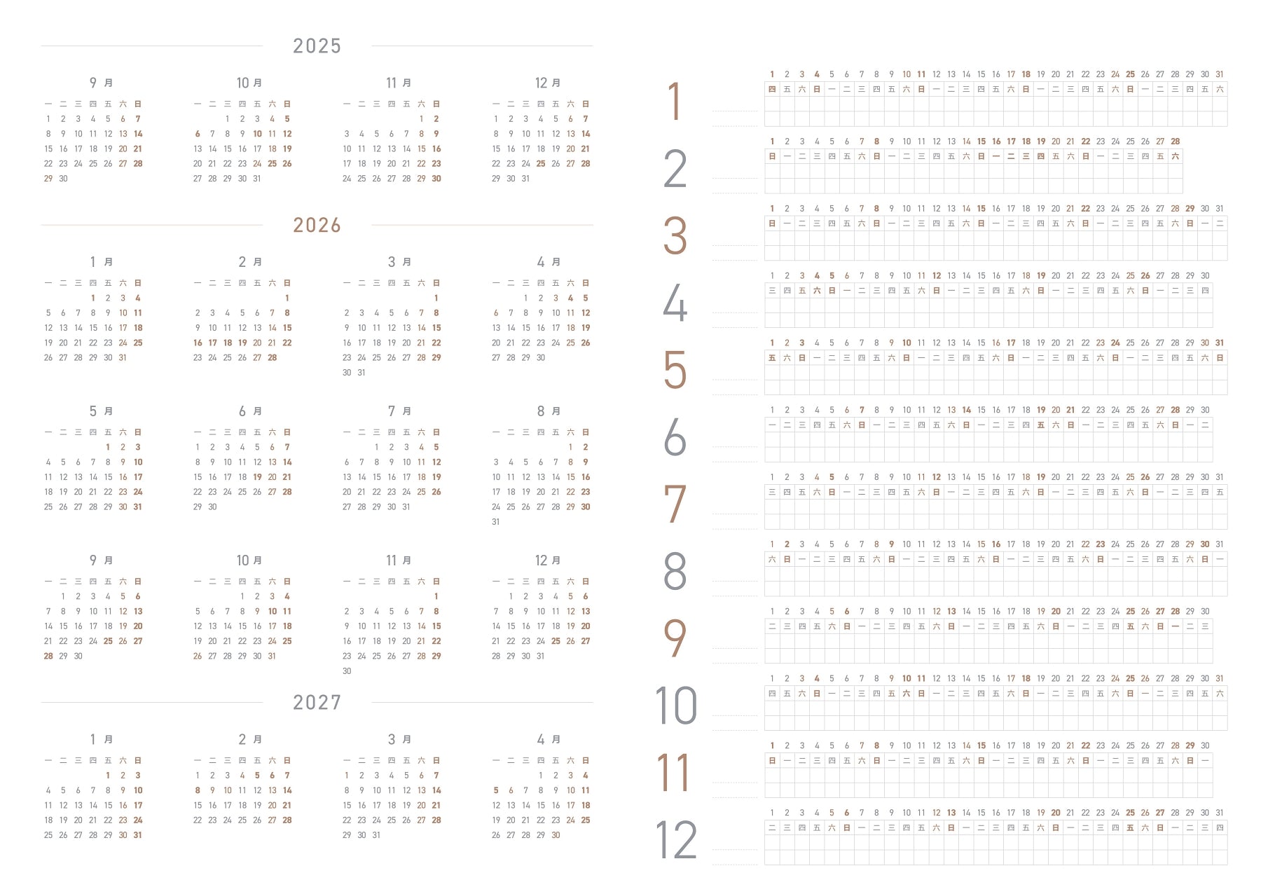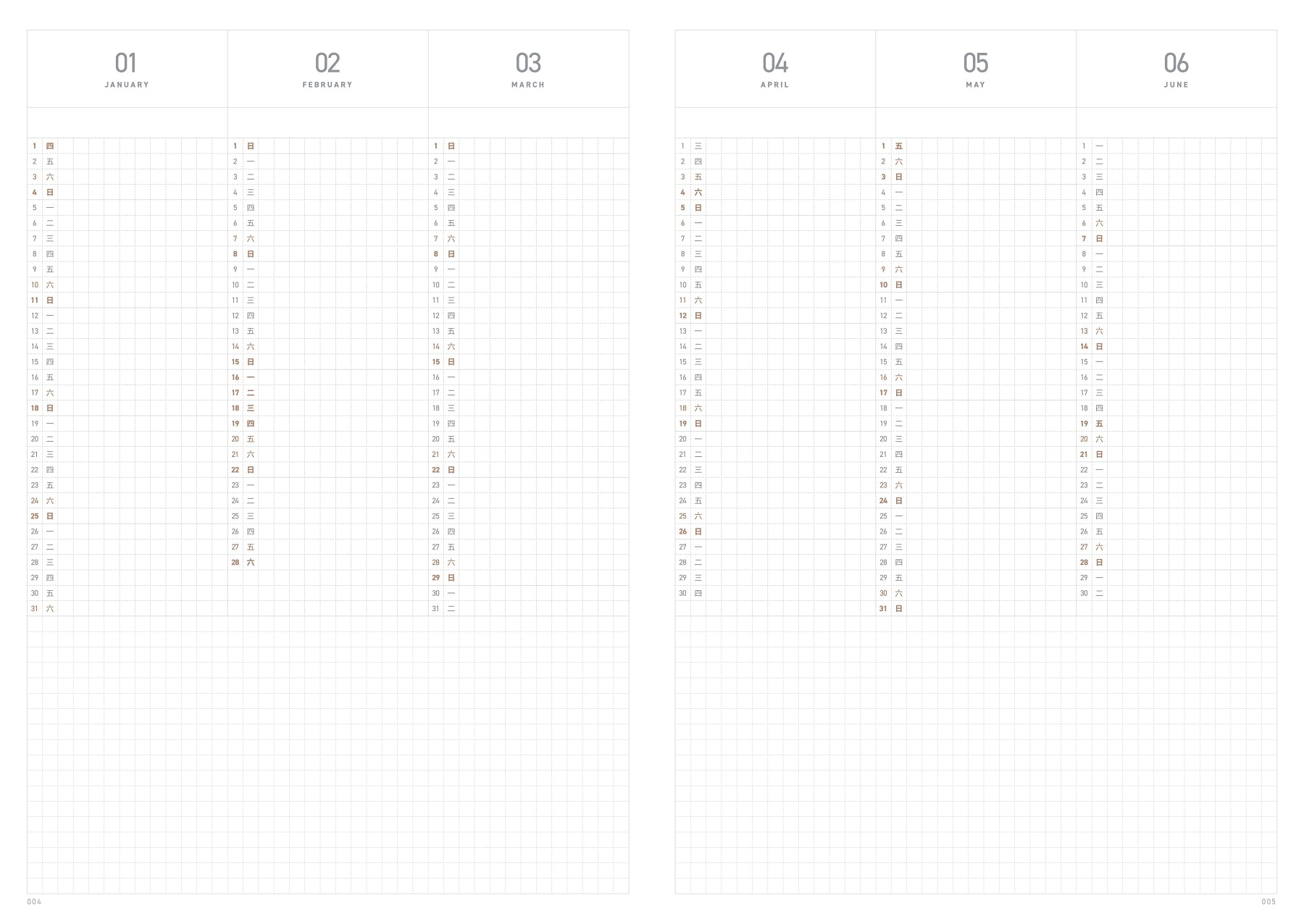 一眼可見半年份的行事曆,非常便於專案管理,也可用作休假規劃、體重管理、習慣追蹤、股票折線圖等其他用途。相對B6與A6的尺寸,表格下方擁有更多記錄空間。