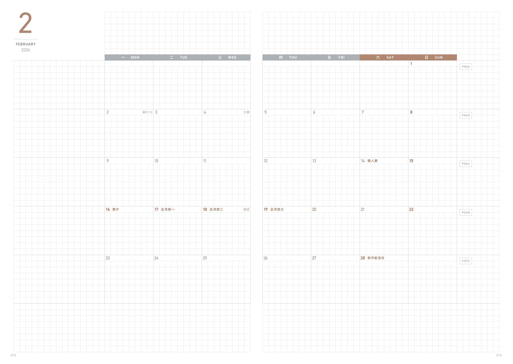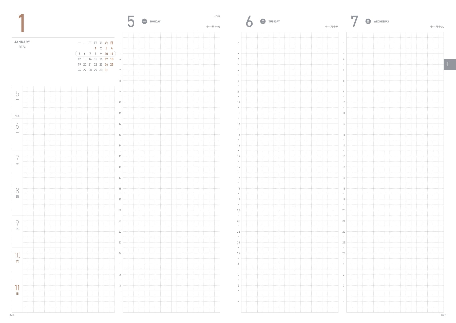 週計畫以兩日一頁的格式呈現,每週共四頁,搭配 24 小時延伸的直式時間軸。這樣的設計讓你可以完整記錄每一天的行程,無論是清晨的第一個會議,還是深夜的靈感片段,都有位置安放。頁面中還有迷你月曆、週曆,以及台灣假期、農曆和節氣的提示,讓資訊一目了然。