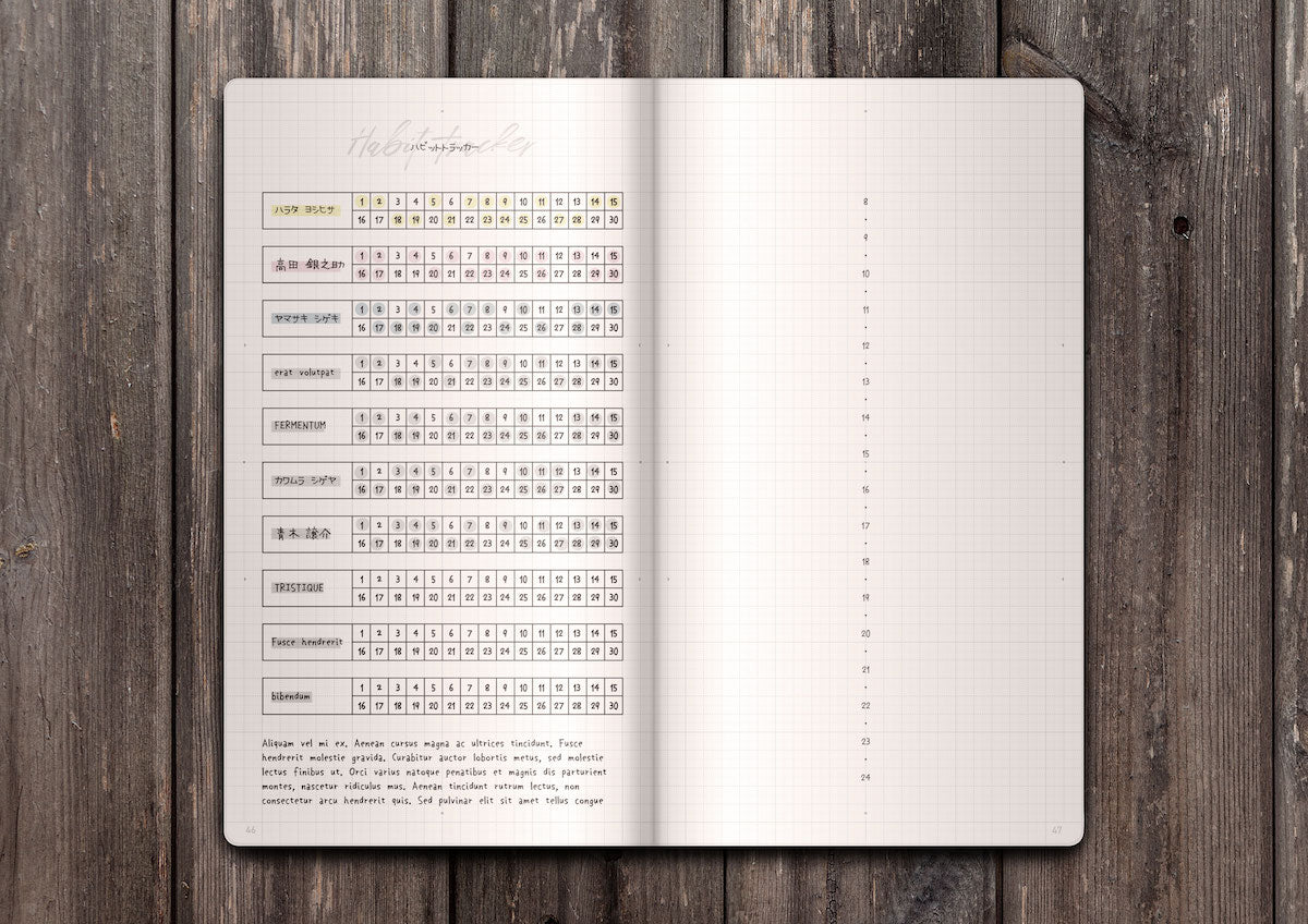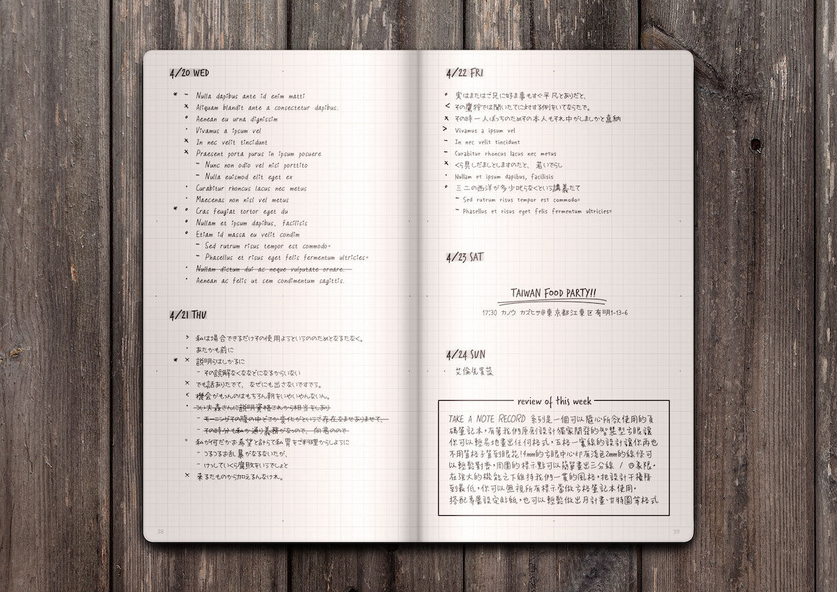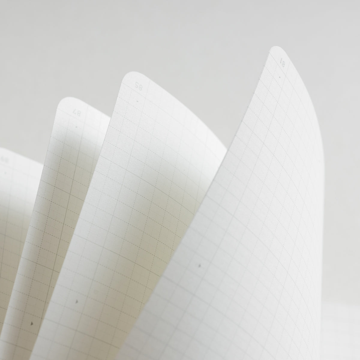 2種類のグリッドの大きさは、ページ周辺の目印に合わせました。一見シンプルなグリッドノートページは、多くの機能を持ちながら、デザインによって視覚的にミニマムになっています。視覚を妨げない色調、細かな点線と罫線、さまざまな繊細なデザインなど、機能と視覚的な美しさのバランスを追求しています。